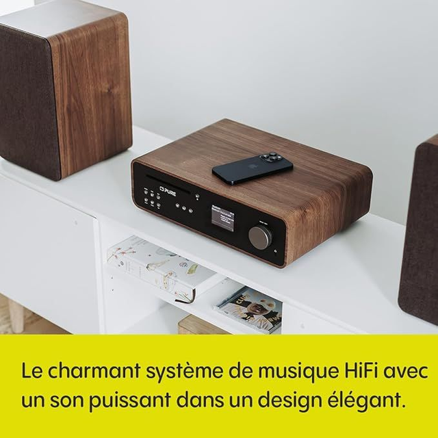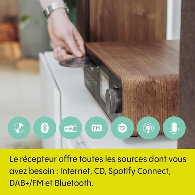 Fais l'expérience de la fascination intemporelle du son HiFi avec notre stéréo classique. Avec une puissance de 100 watts, ce système doté de nombreuses fonctionnalités offre une expérience polyvalente, notamment Internet, la radio DAB+/FM, Bluetooth, le lecteur CD et Spotify Connect. Avec des boutons intuitifs, une télécommande, un écran TFT aux couleurs éclatantes et des optiques design en bois, élève ton voyage audio avec élégance et commodité.
